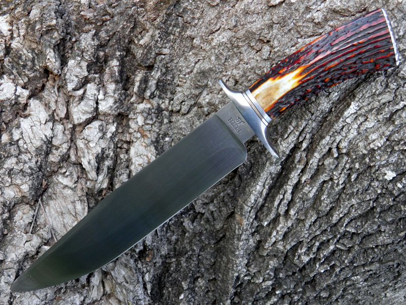 This is a Carbon Steel Bowie. The Blade is 9 1/4" inches long forged from 5160 Carbon Steel.The OAL is 15 1/4". The Guard, two spacers,and Butt Cap are 416 stainless. One spacer is Silicone Bronze. The Handle is Amber Dyed Sambar Stag. This knife comes with a Kenny Rowe Sheath and custom Zipper Case.