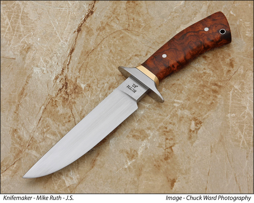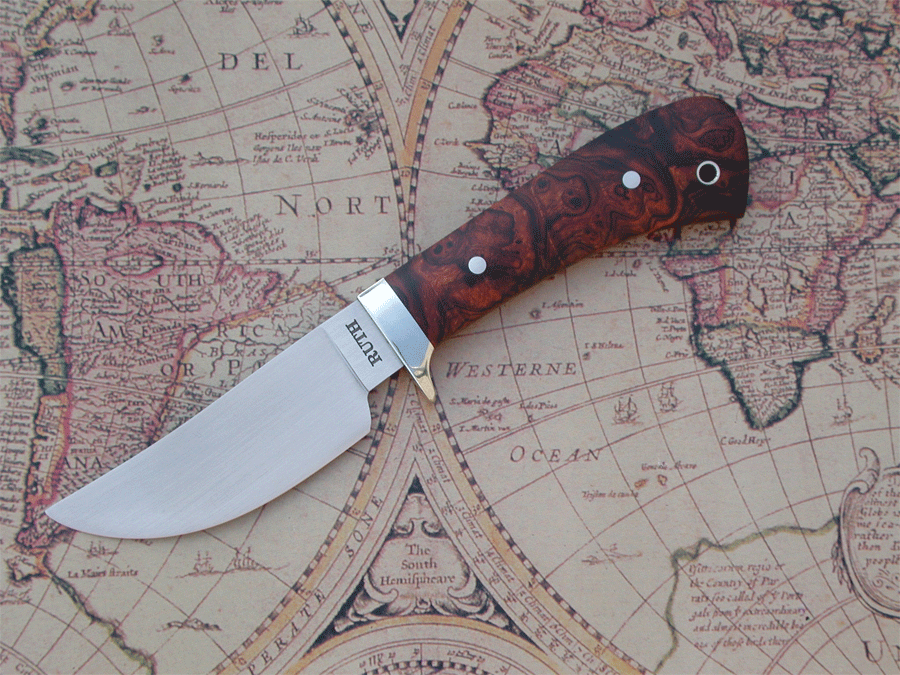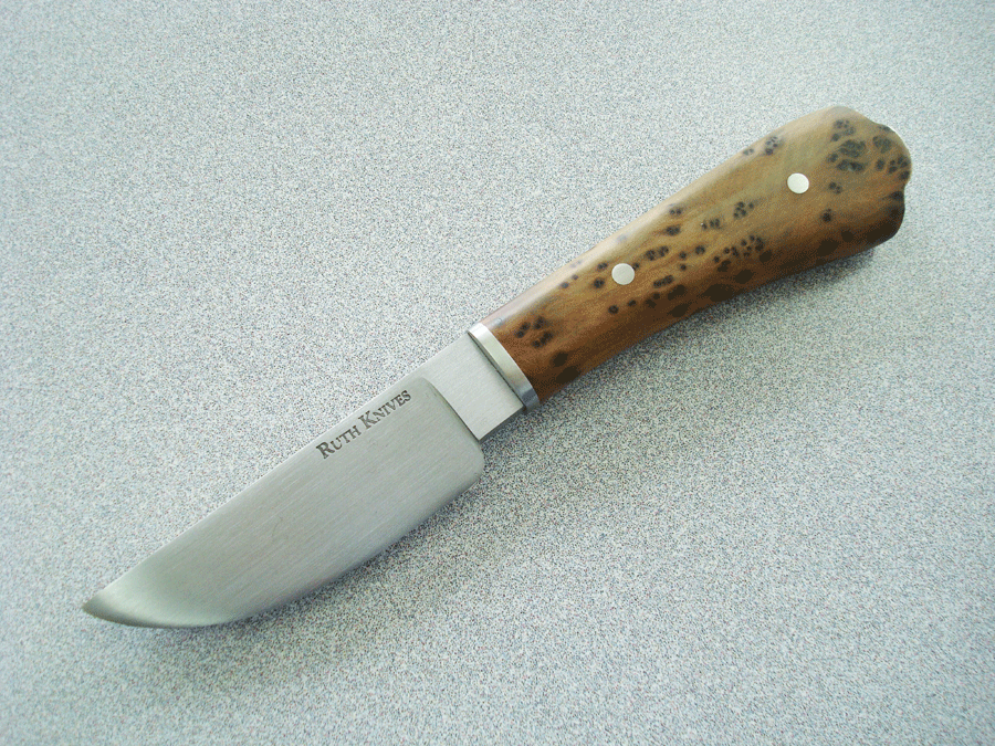 This knife was made by my son Michael, and myself. The maker's mark "Ruth Knives" shows this.This is a small hand forged carbon hunter with Thuya Burl handle. The blade length is 3 7/8 inches, with an overall length of 8 inches. Made from 5160 Carbon Steel. This hunter/skinner is