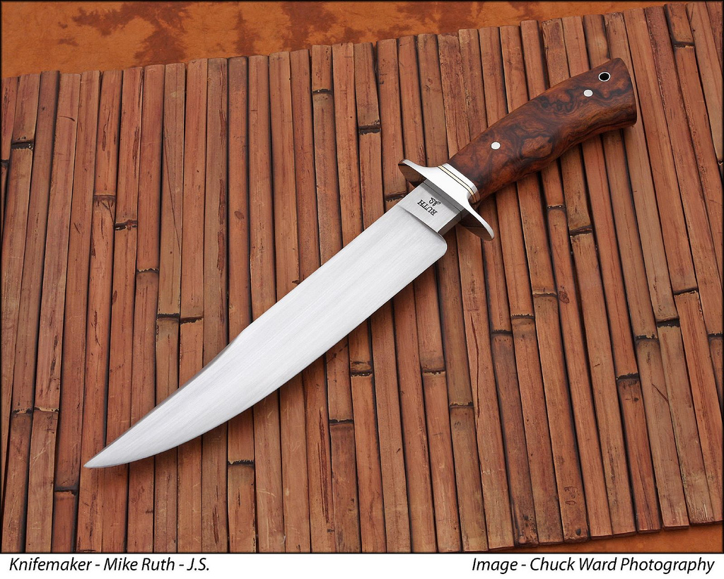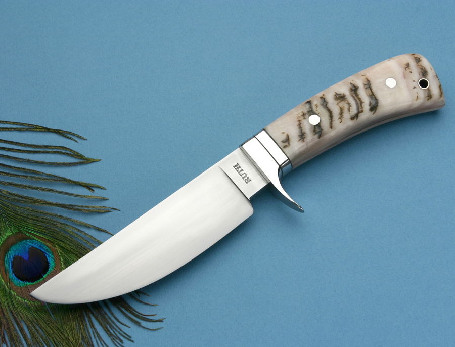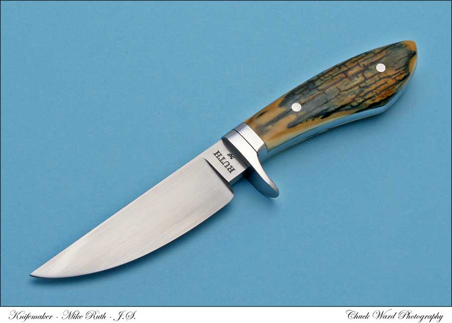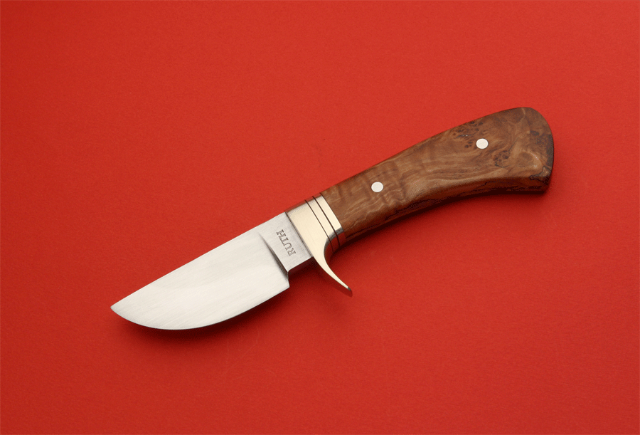 This is the first knife that my son Michael and I made together. The maker's mark is "Ruth Knives" to show this. This hand forged carbon steel hunter is made from 5160 steel. It has a blade length of 4 3/16 inches. The Spacer and pins are stainless steel.The handle is made from Maple Burl, with a stainless thong hole. This knife has an overall length of 8 1/4 inches. This knife comes with a Kenny Rowe sheath.