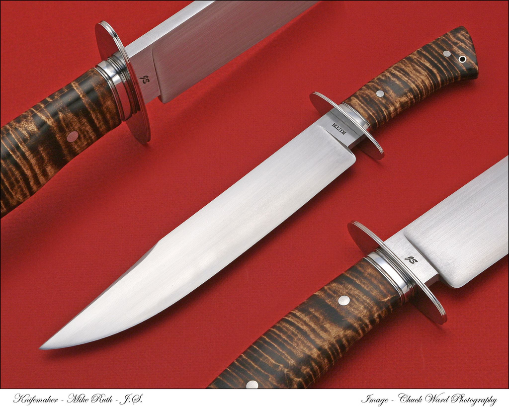 This knife is forged from 5160 Carbon Steel. The Blade is 11 3/4" long with an OAL of 17 3/8". It has 416 Stainless Steel guard & ferrule. It has a curly maple handle. This knife comes with a Kenny Rowe sheath, and custom zippered case.
