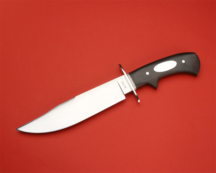 This bowie is hand forged from 5160 carbon steel and the blade is approximately 8" long with an overall length of 13 1/8 inches. The guard & pins are stainless steel. The escutcheon is made of German silver, and the ferrule is fine silver. The handle is made from African Blackwood with a hand rubbed finish.